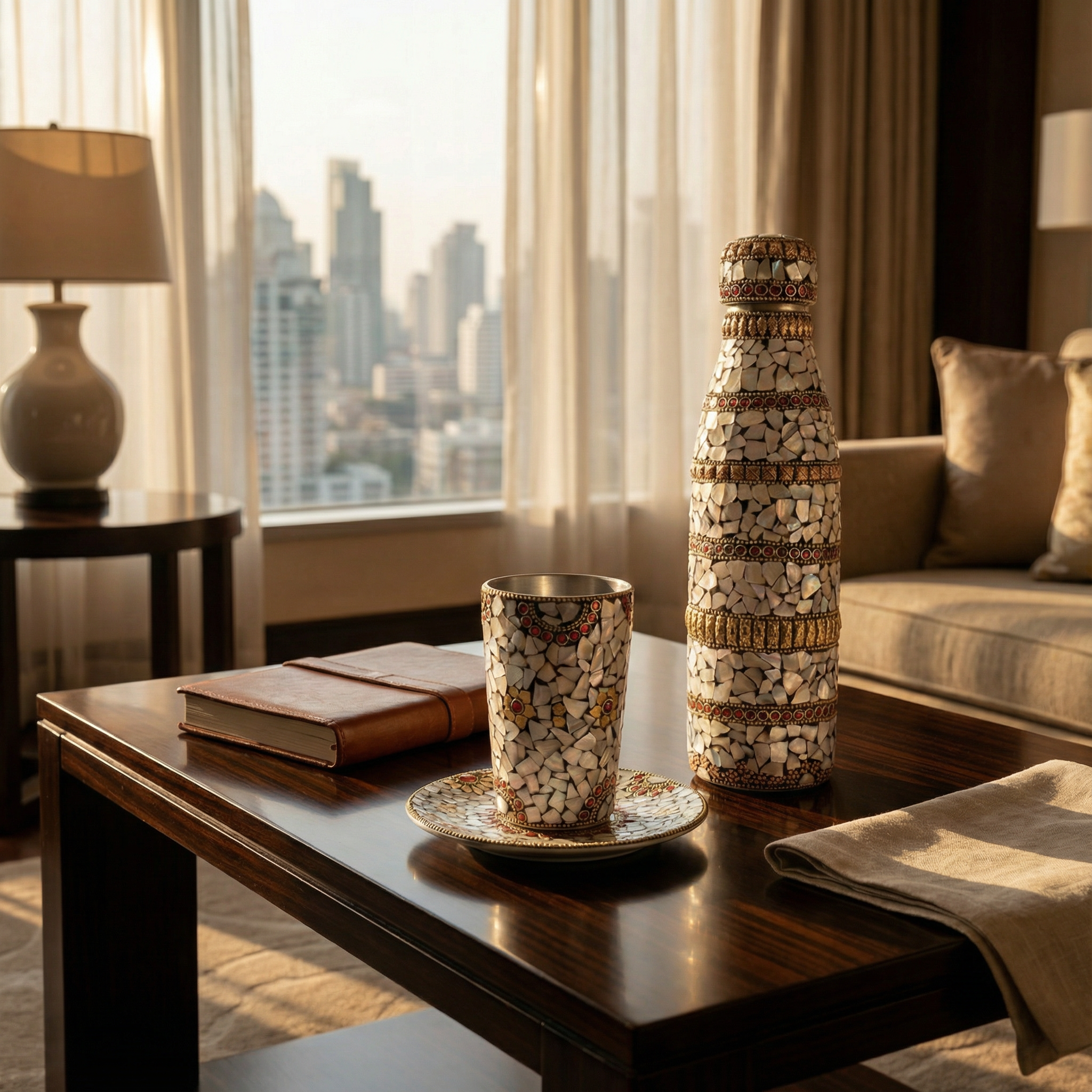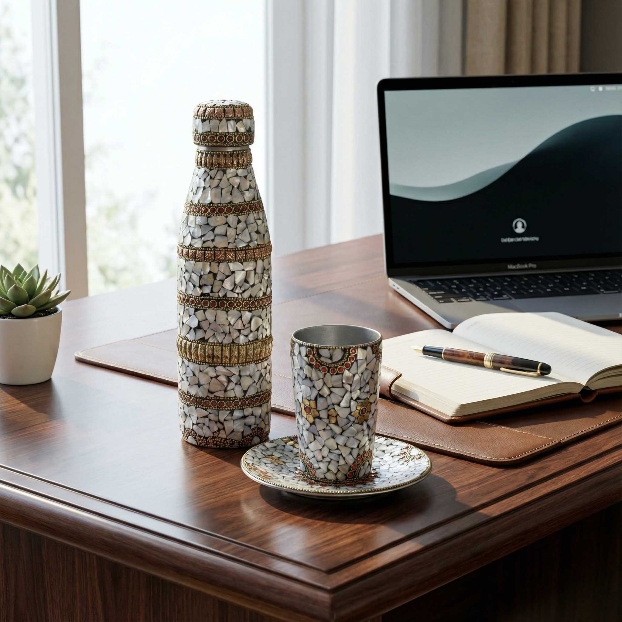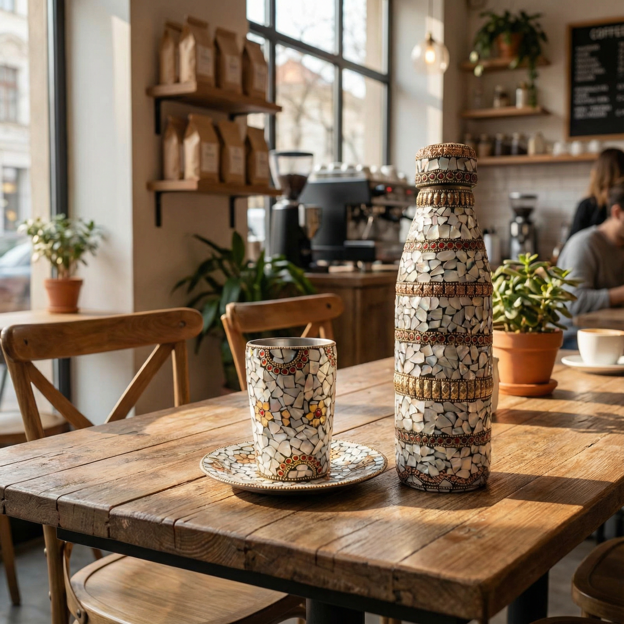 This mosaic thermos table set brings together function and ornament in a refined composition designed for both everyday use and elevated hospitality. Each piece is meticulously handcrafted, adorned with hand-set mosaic fragments and delicate metal detailing that catch the light with subtle brilliance.