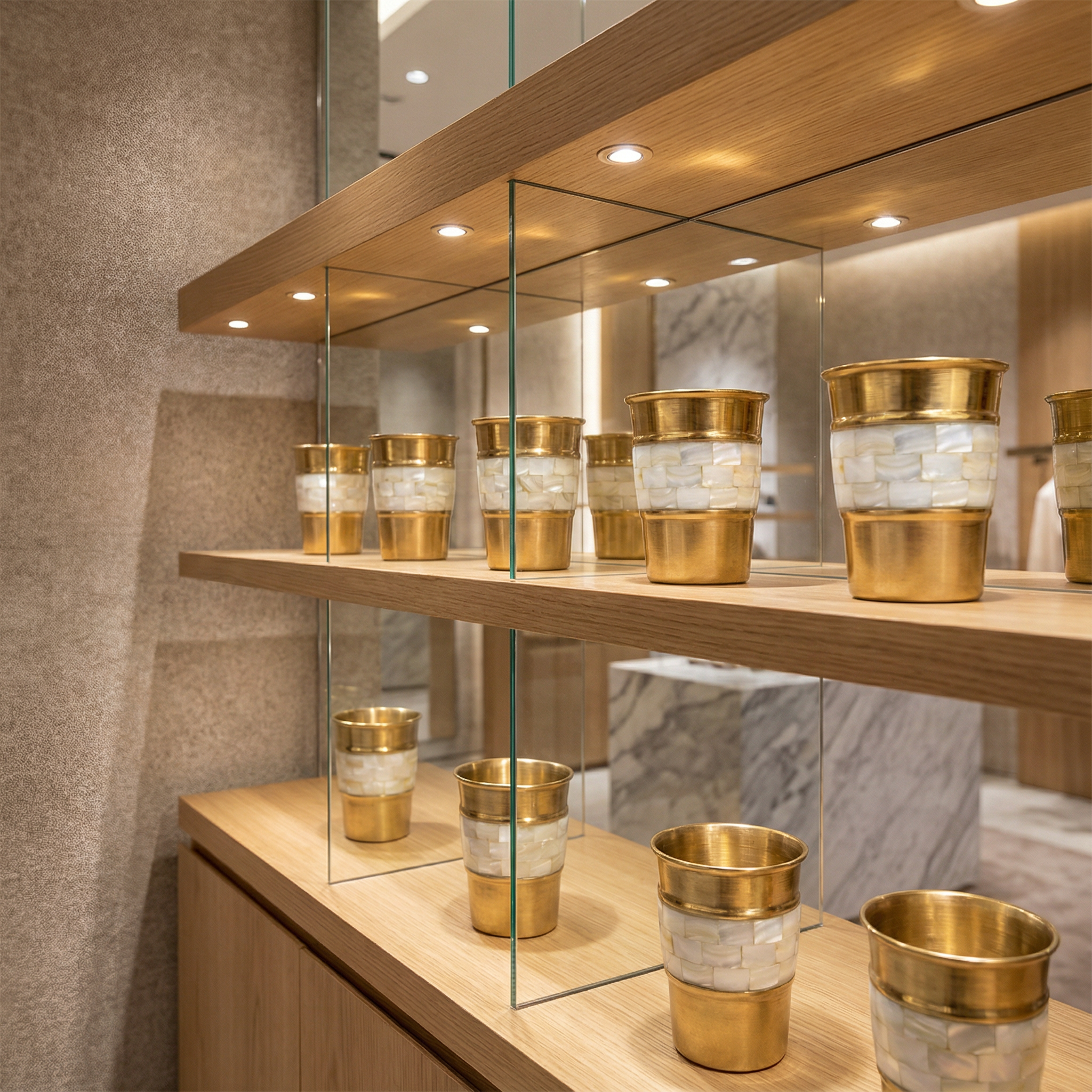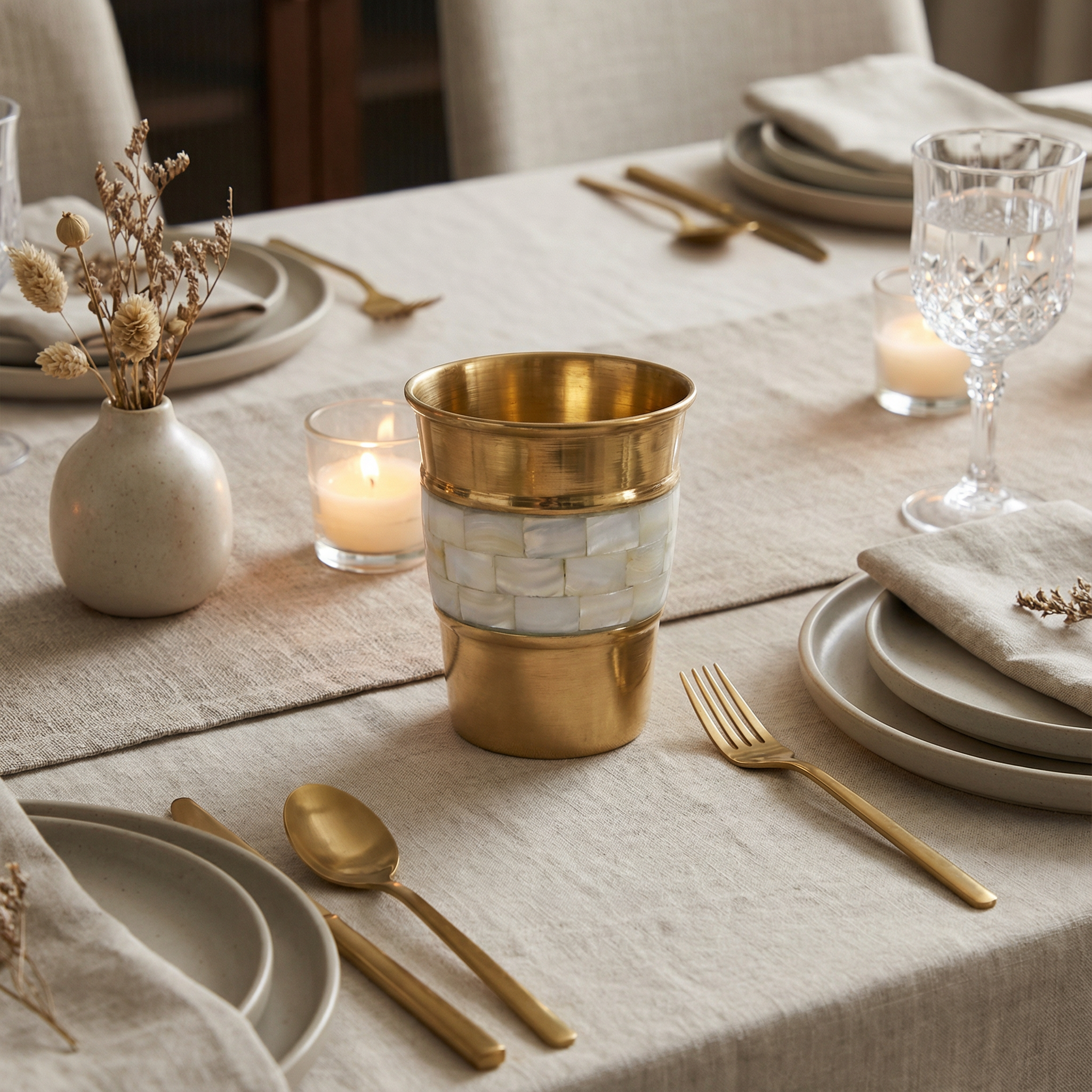 Made from solid brass and adorned with hand-set natural stone mosaic, each cup carries subtle variations that make every piece unique. The contrast between warm metal and cool stone creates a quiet balance, tactile, grounded, timeless.