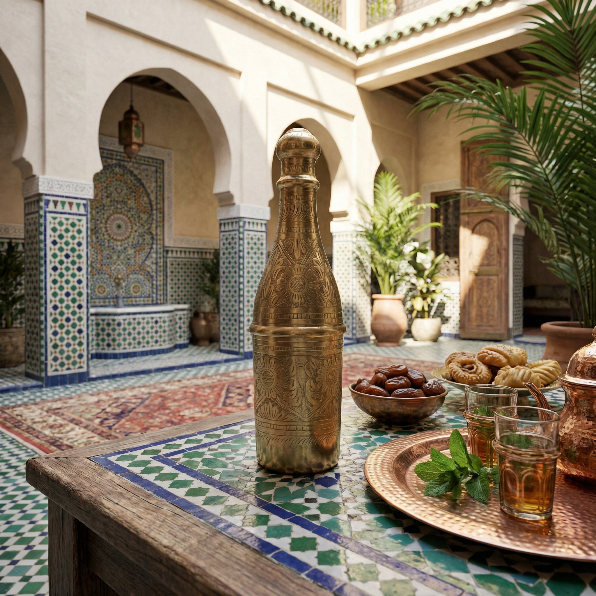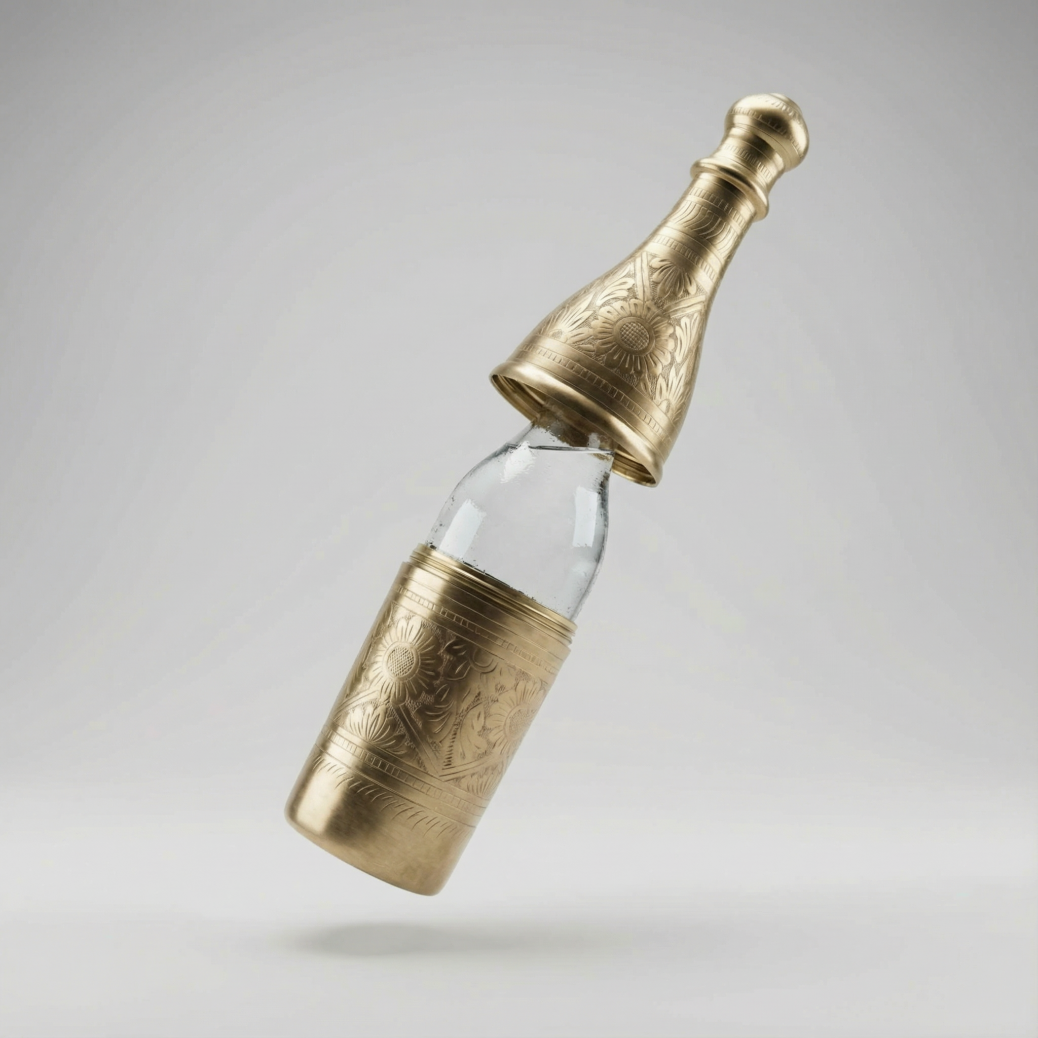 Crafted in solid brass, its exterior offers warmth, weight, and permanence, while its inner cavity is shaped to cradle a glass bottle discreetly. This duality, outer strength, inner purity  defines the Motheغ Bottle’s purpose: to turn hydration into an intentional, elegant gesture.